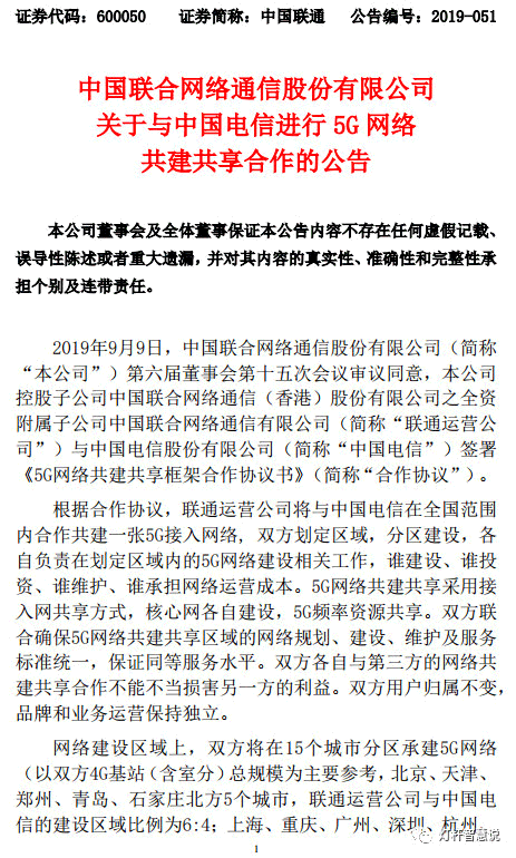 9月9日,中國電信股份有限公司與中國聯合網絡通信有限公司簽署了《5G網絡共建共享框架合作協議書》(以下簡稱“協議書”)。